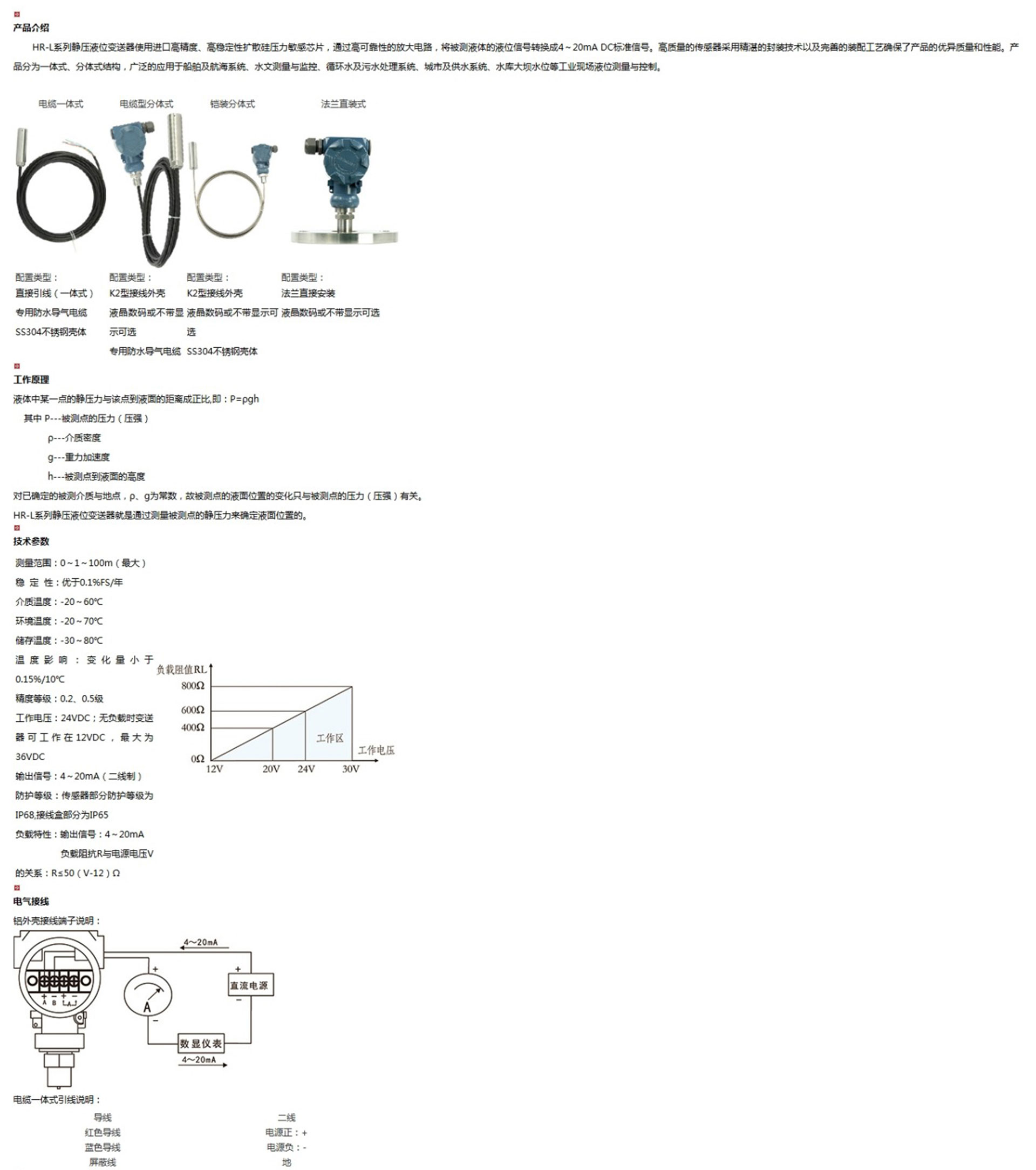 HR-L系列靜壓液位變送器使用進(jìn)口高精度、高穩(wěn)定性擴(kuò)散硅壓力敏感芯片,通過(guò)高可靠性的放大電路,將被測(cè)液體的液位信號(hào)轉(zhuǎn)換成4~20mA DC標(biāo)準(zhǔn)信號(hào)。